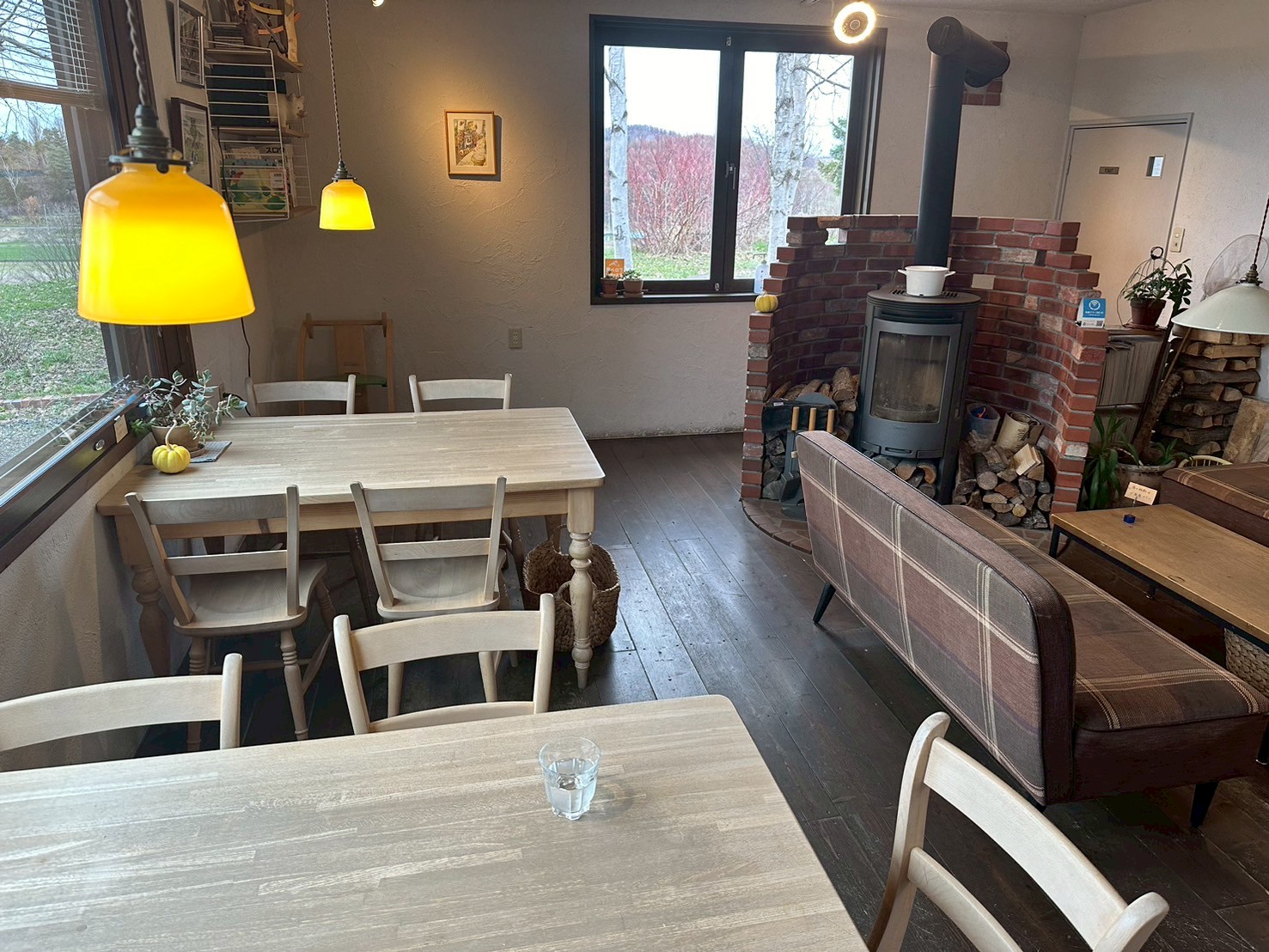 夏は緑の丘を吹き抜ける風が心地よく、冬は店舗内の薪ストーブでぽかぽかと暖まりながらアイスを楽しめます。まるで絵本の中に出てくる牧場カフェのような雰囲気で、のんびりと過ごせる癒しの空間です。